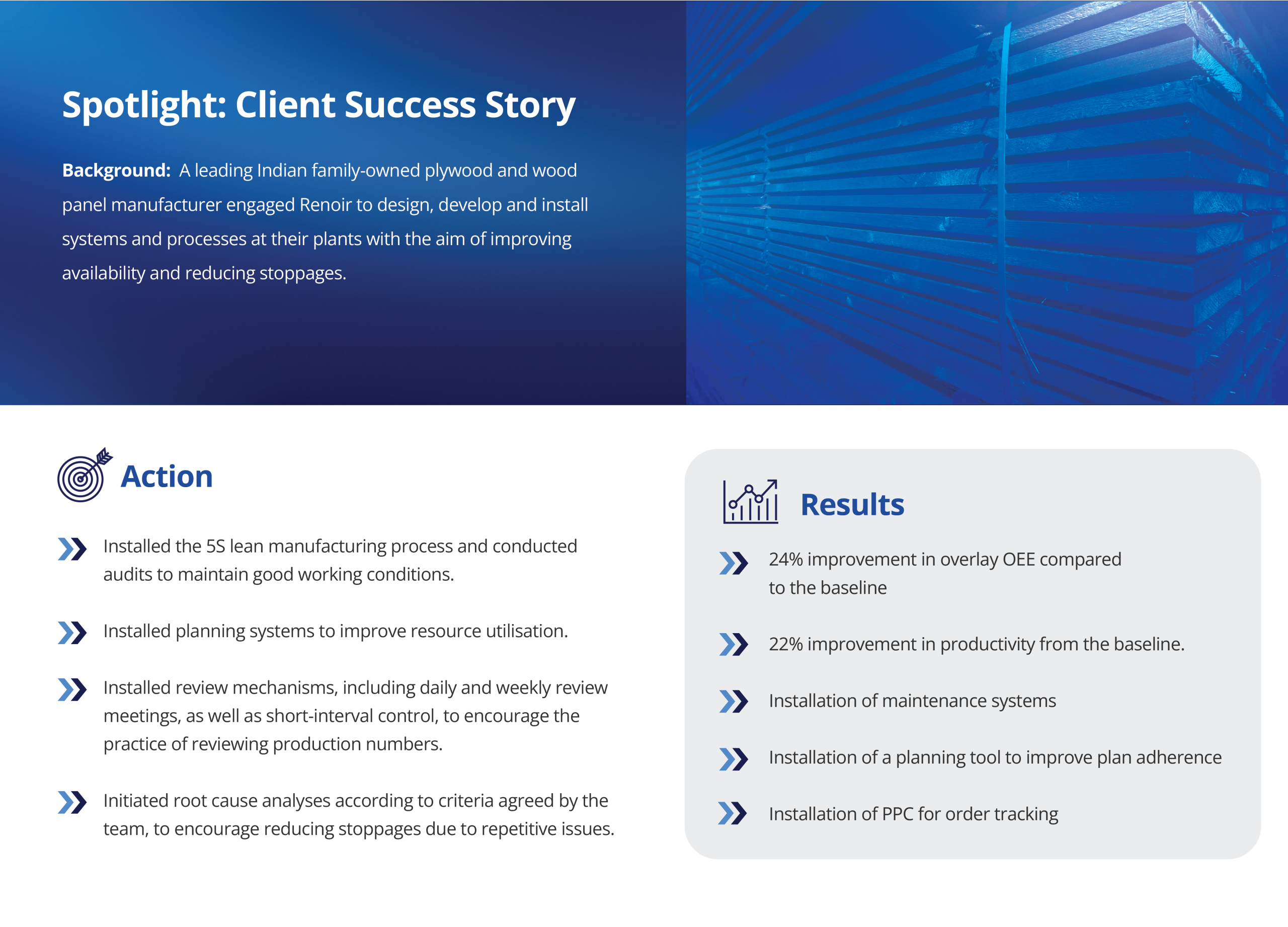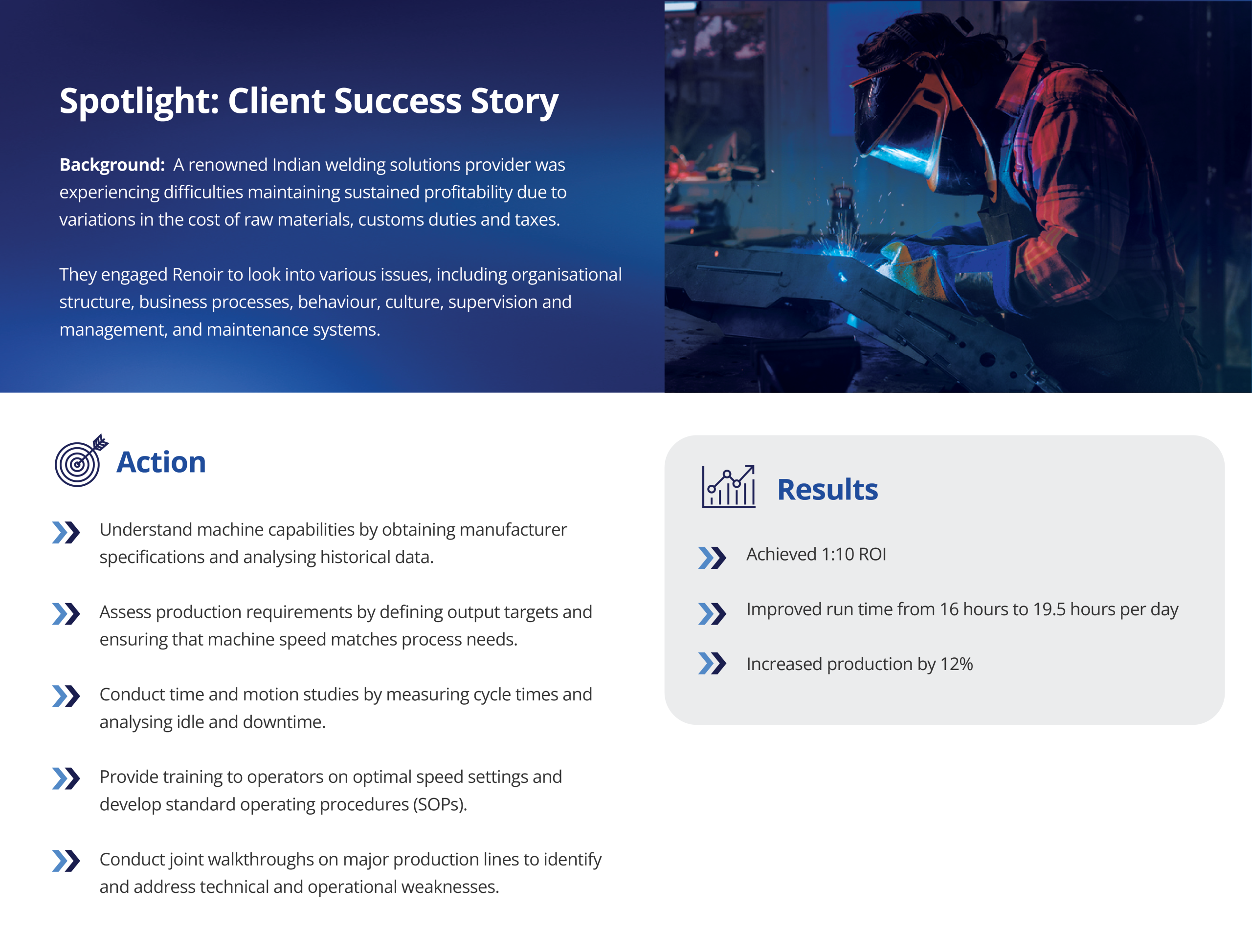 Renoir has over three decades of experience working with more than 300 companies to help them achieve operational excellence. Some of these are repeat engagements from the same company. We work closely with our clients’ employees to assess their as-is situation before providing customised solutions.