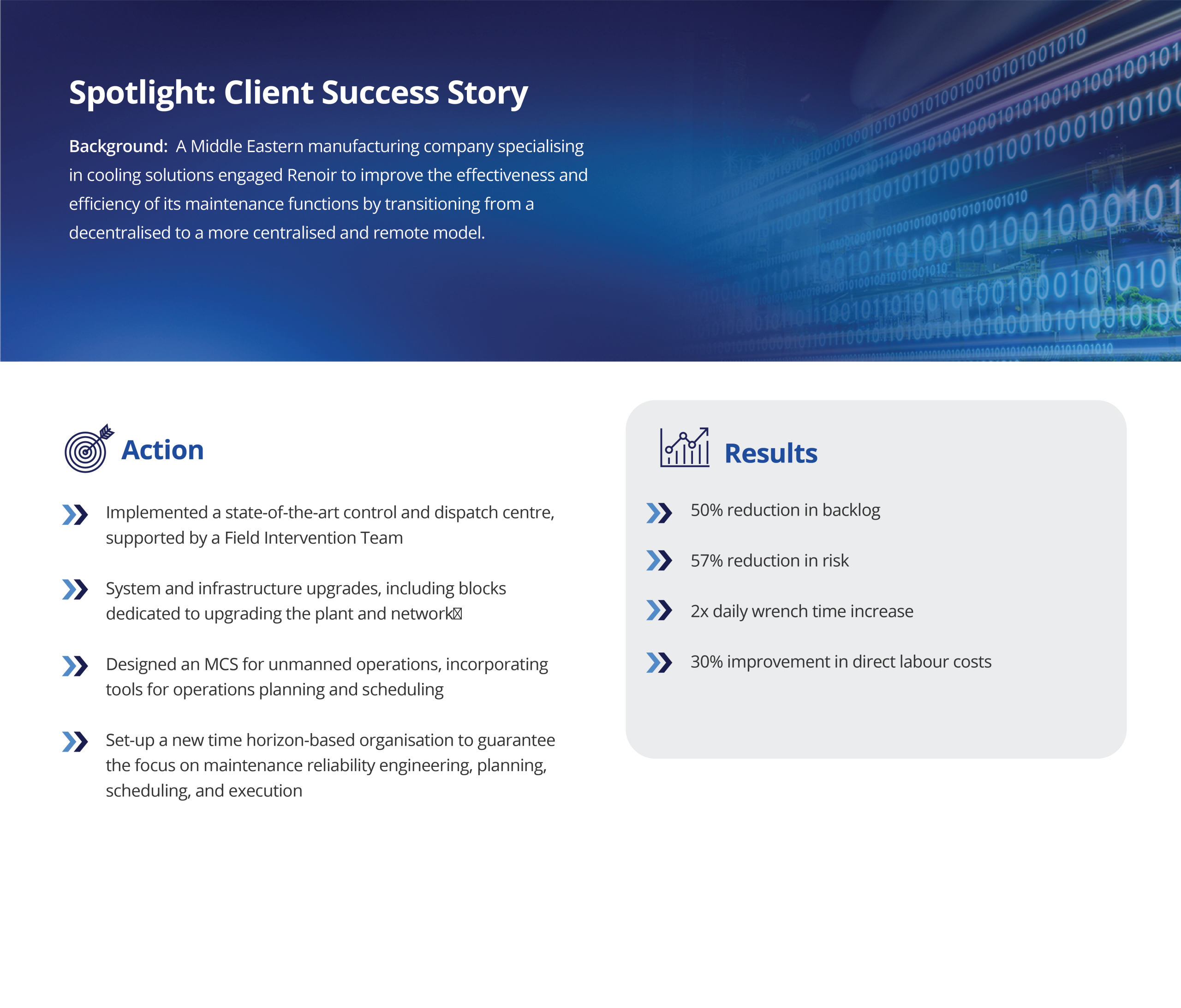 - Integrated Management Control Systems (MCS): Standardised KPIs and dashboards that align operations, maintenance, quality and planning.