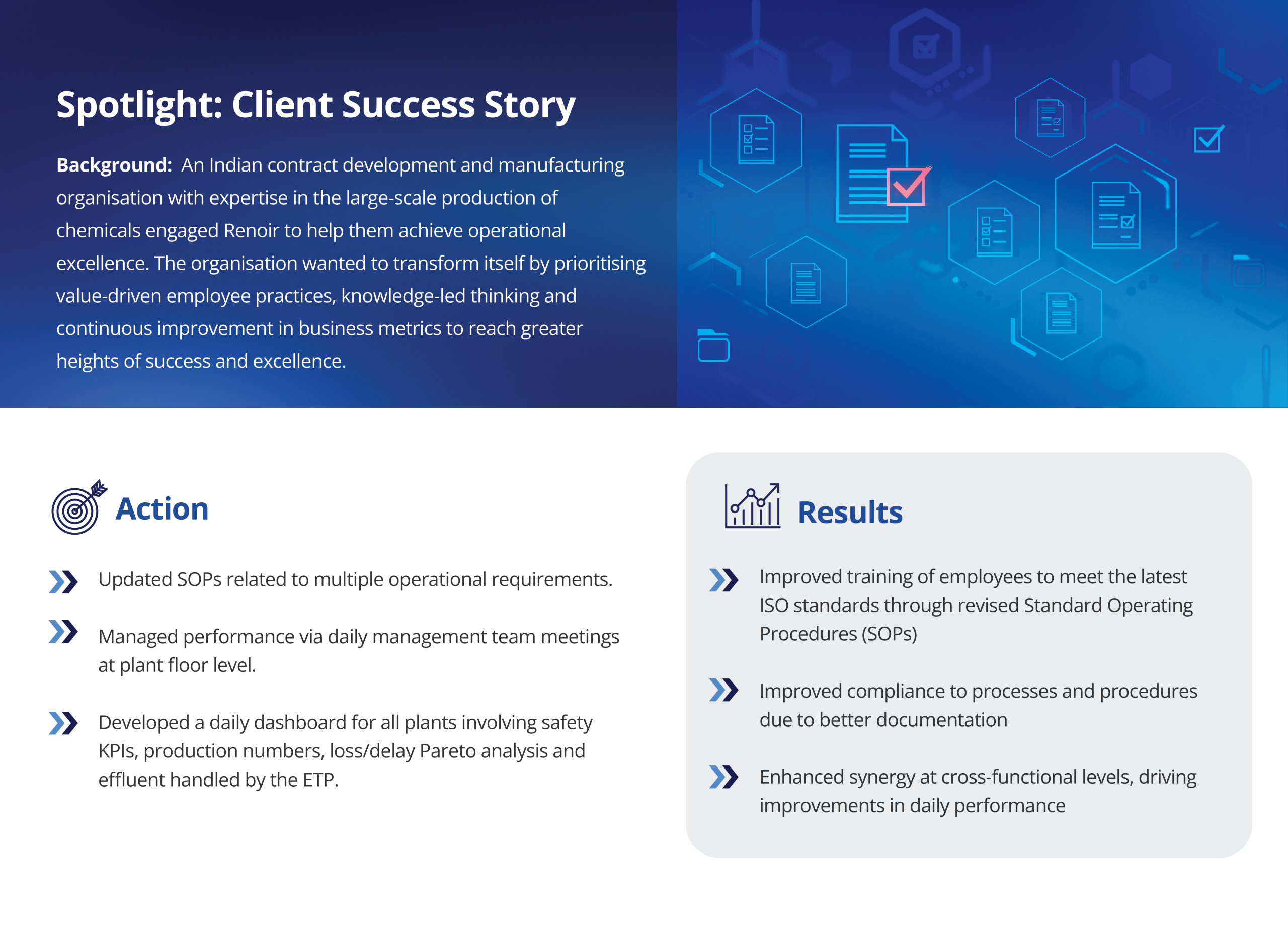 With more than thirty years of experience, Renoir has supported hundreds of companies across various sectors, including manufacturing, in overcoming obstacles that slow innovation and growth by conducting thorough “as-is” assessments and delivering customised solutions. Our success lies in the change management approach where we work closely with our clients as partners – from blueprint to execution – using a top-down, bottom-up, end-to-end approach. By the end of the project, our clients are equipped with the tools and capabilities to maintain a culture of continuous improvement.